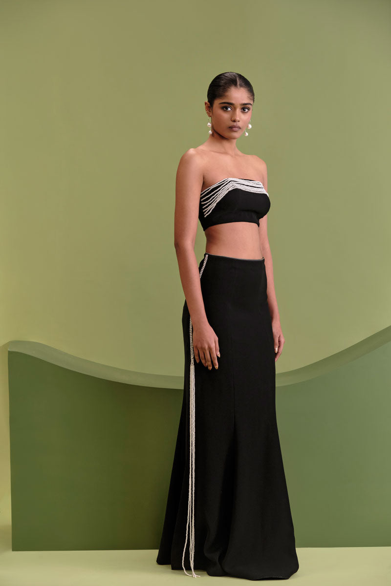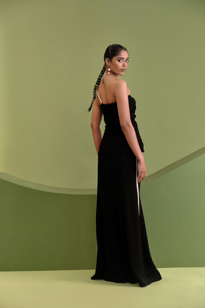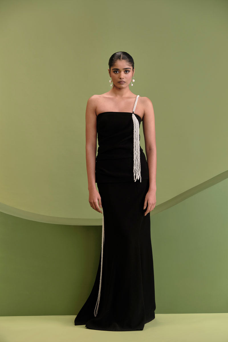 This sophisticated one-shoulder set is engineered for transformative wear. Crafted from sleek microsuit fabric, the ensemble includes a pleated top and a full-length skirt, both featuring detachable zips for separate use. The pleated top is dramatically accented by cascading pearl drop tassels at the shoulder. The skirt finishes the look with a high side slit and a matching vertical pearl trim, blending structure and high-impact movement.