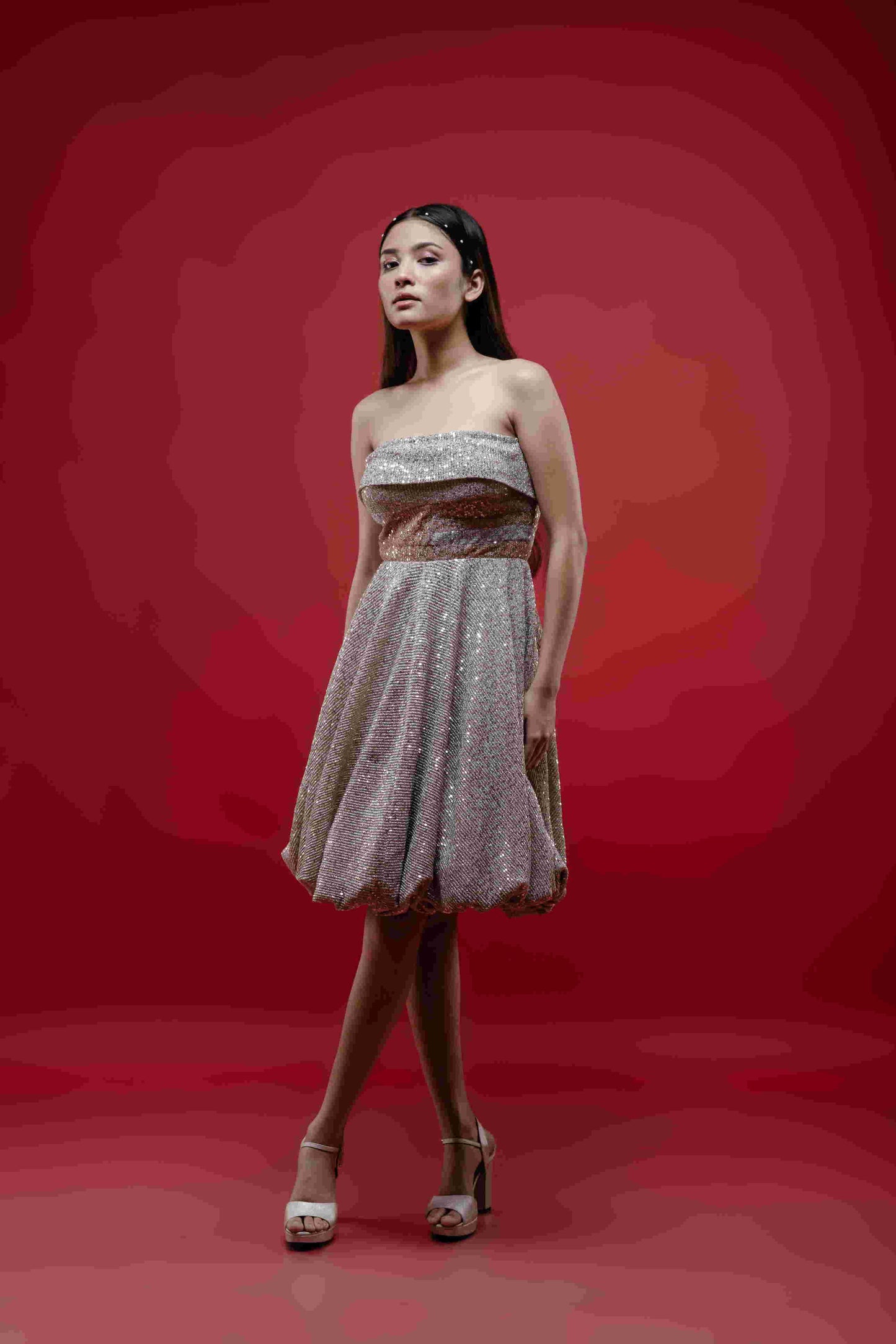 The gown is crafted from a stunning silver fabric that sparkles and shimmers with every movement, reminiscent of a starry night sky. The celestial-inspired detailing adds an ethereal touch, creating a sense of magic and allure.The balloon silhouette of the dress creates a voluminous and dramatic effect, with the skirt billowing out in a captivating fashion. It gives you a sense of floating on air, adding a whimsical and fairy-like quality to your appearance.The absence of straps allows for a clean and streamlined look, emphasizing the elegance of your neckline and collarbone. The strapless design also offers the freedom to accessorize with statement jewelry or opt for a more minimalist approach, depending on your desired aesthetic.