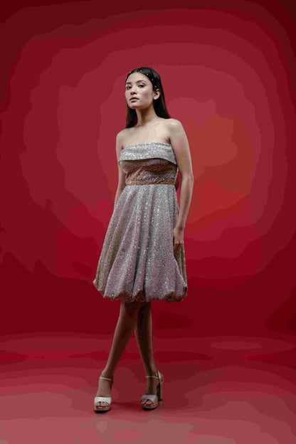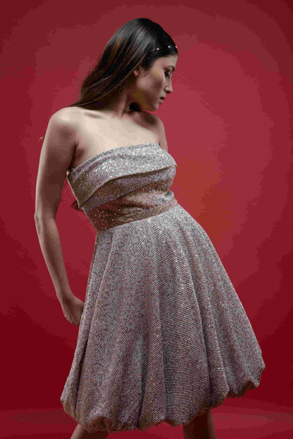 The "Stellar Glitterburst Gown" is a mesmerizing and enchanting dress that embodies the essence of celestial elegance. This balloon dress features a strapless design, allowing you to showcase your shoulders and accentuate your natural grace.