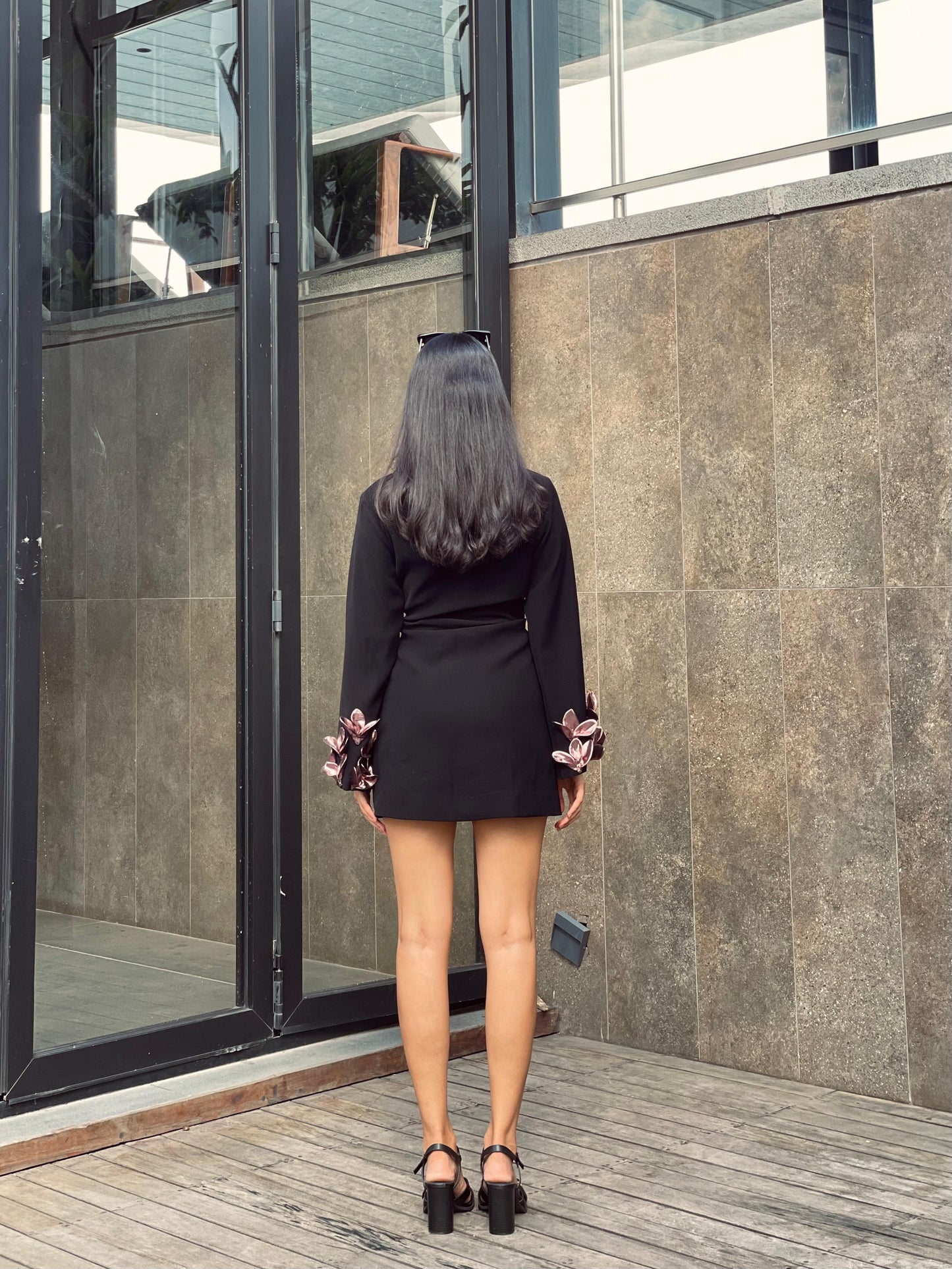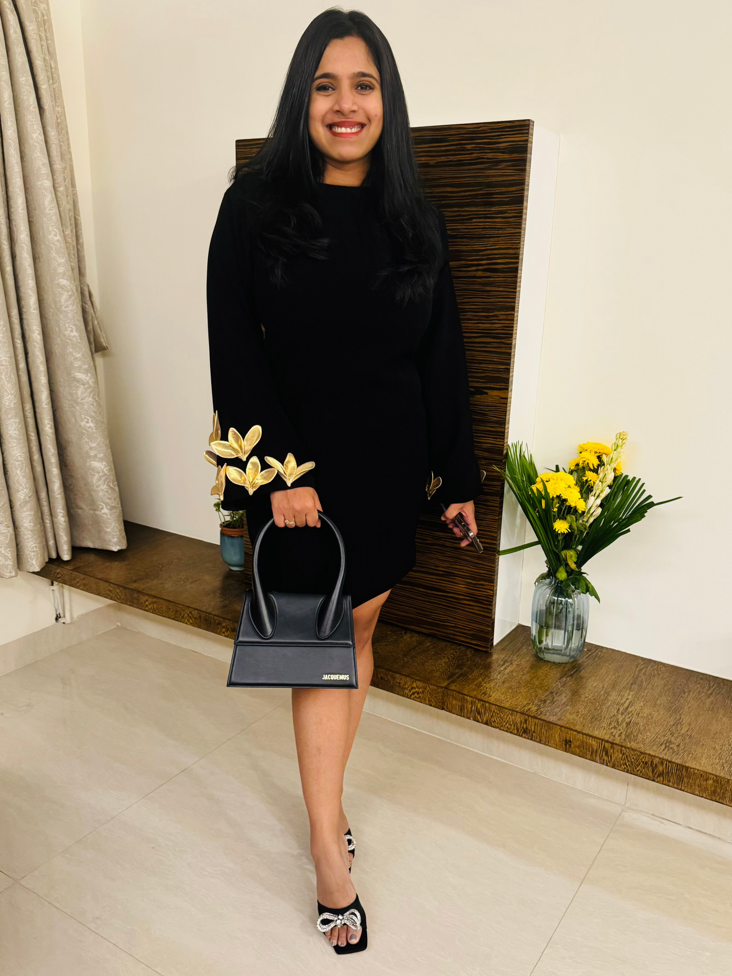 Step into confidence in our a-line black dress with handcrafted metallic floral attachments.