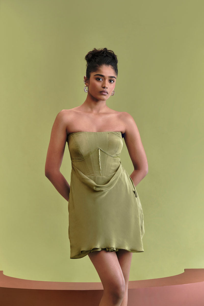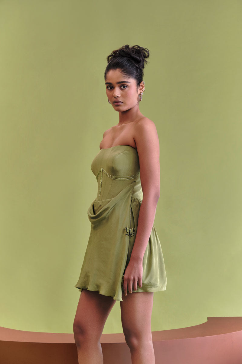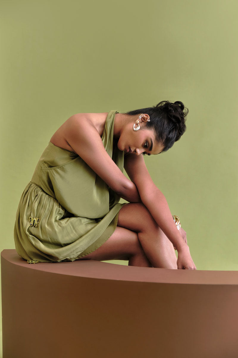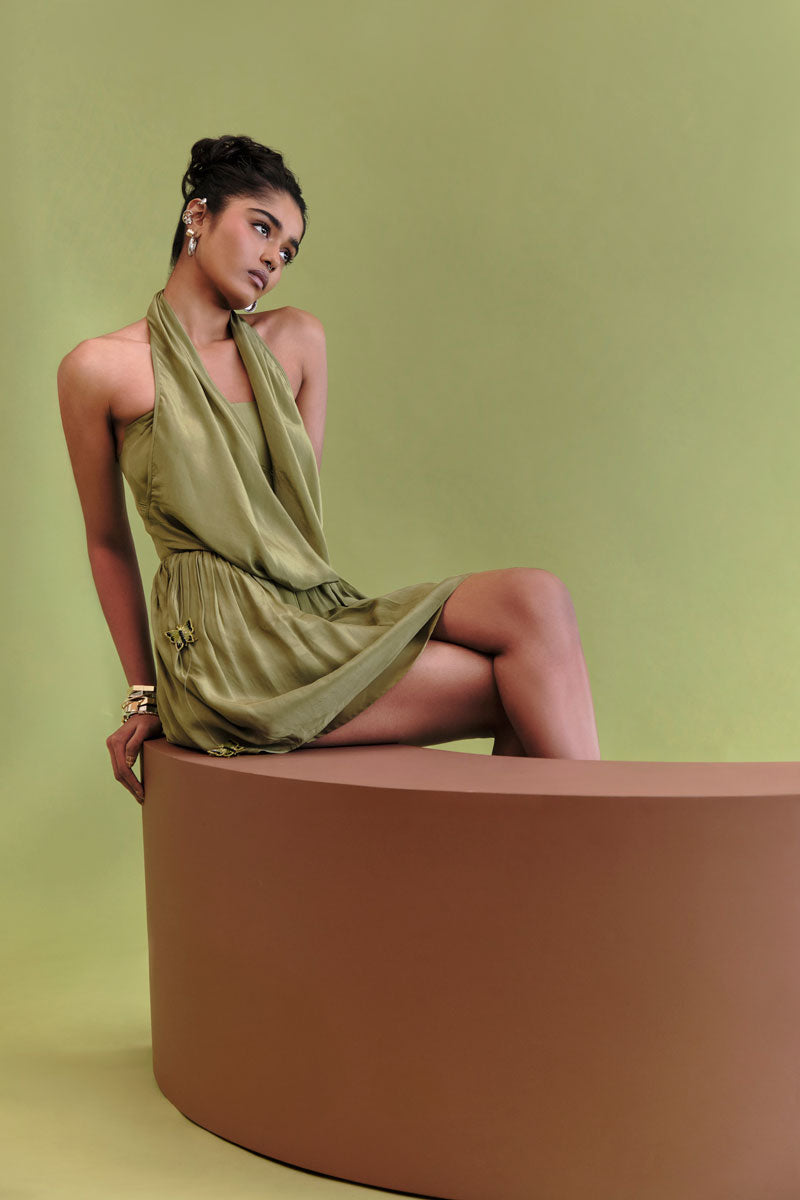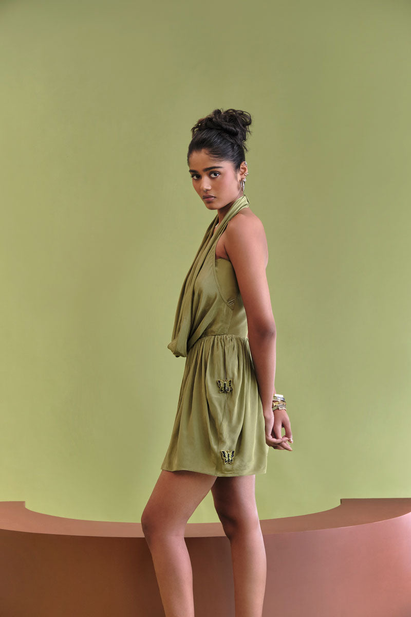 Introducing the transformative essence of our AW25 collection, Transform cowl mini Crafted from fluid crepe, this mini dress features an elegant draped cowl neckline that contrasts sharply with a structured, hidden internal corset top. The entire piece flows into a voluminous flared skirt, detailed with delicate, hand-stitched embroidered butterflies and playful tassels for an utterly charming finish.